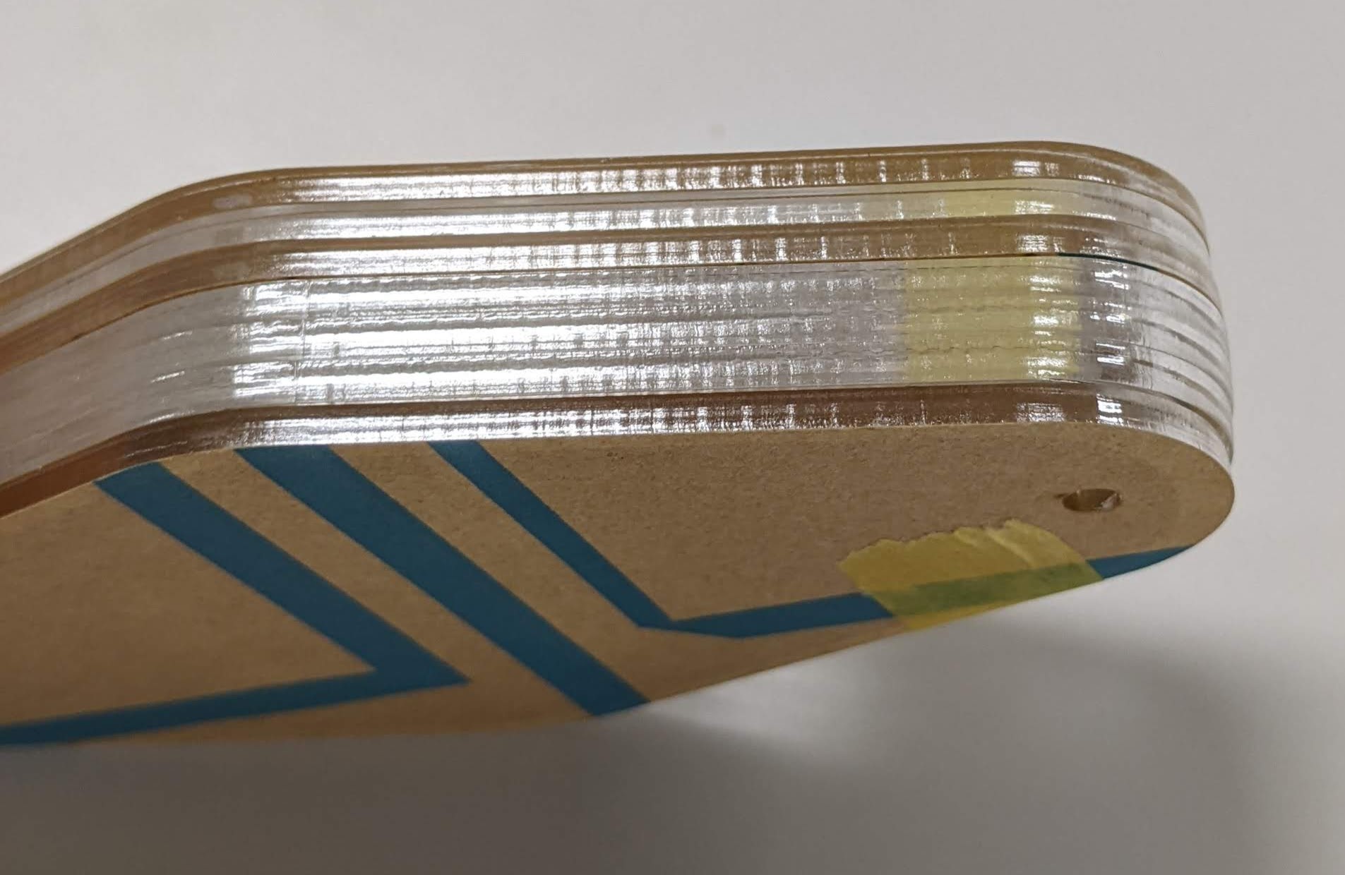 しかし、両面に貼ってある保護フィルムのうち裏面側が、一部分切りきれていなかったことは特筆に値する。どうやら使用している機材の特性で、台に向かって右側のエリアの出力か焦点が、向かって左側のエリアと比較して劣っているのだと思われる。最初の焦点あわせも実験もすべて左側に合わせて実施しているため、これが効いているのだろう。